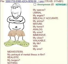 The meme makes fun of hobbies and cultural identifiers which are often used by millennial people trying to seem quirky and smart. They come off as “soy” which is hard to capture in words. As I write this I realize that it’s inevitable that 10 years from now even the word “quirky” is gonna fade out of use or the meaning is gonna drift. Which is maybe a good thing if our internet culture fades into obscurity. Hopefully people in the future will be building bonfires on the beach and dancing for fun.